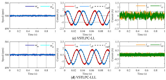 Steady-state response at 500 rpm and 85% of the nominal torque using conventional VSTPLC (a) and the proposed controller with ML-VVV (b), LL-VVV (c), and LLL-VVV (d). From left to right: mechanical speed and αβ and xy stator currents.