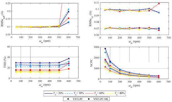 The original VSTLP controller is compared with the proposal using ML-VVV, since LLL-VVV provides similar results and our interest in LL-VVV is limited to high-speed/torque demanding operations. Figure 8 summarizes the results obtained. Regardless of the speed and torque demand, the proposed controller provides lower harmonic distortions in the stator currents due to the reduction in the xy stator voltage components (lower RMSxy values). In contrast, there are no important differences in the regulation of torque and flux, except in high-speed operations. Note that NCPC increases significantly in the proposed controller with the application of the VVV concept. This is a direct consequence of using VVV and two switching states of the 5p2L-VSI in the same sampling period, while only one switching state is applied in the case of the original VSTPLC method. This result can generate a disadvantage when using the proposed controller because it can force an increase in the switching losses of the power converter.