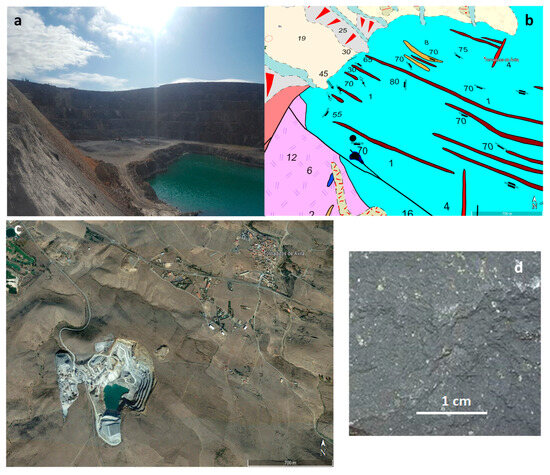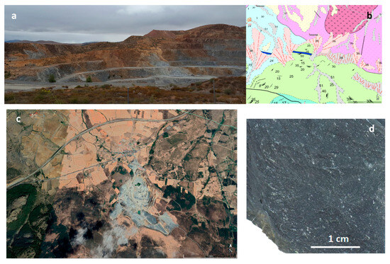 Figure 2. Sample B-2. (a) General view of the quarry. (b) Geological map of the area. (c) Aerial photograph. (d) Hand-shown material. Source: Google Earth Pro. Scale: 1:700.
