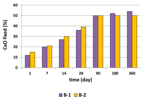 The pozzolanicity test results for both study samples are presented in Figure 3. The fixed lime measurements are very similar, with slightly lower values in sample B-1 at early ages (indicating a slightly slower lime fixation). However, after more than 90 days of pozzolanic reaction, the trend reverses. When comparing this type of addition—ballast waste—with other materials used in the cement industry, such as silica fume, fly ash, or even non-standardized additions like sanitary ceramic waste or slag from the steel or copper industry [50] a similar behavior was initially seen, with slow pozzolanic activity. However, by 28 days—the age considered in the regulations—a greater lime fixation capacity was achieved compared with those reported in the literature.