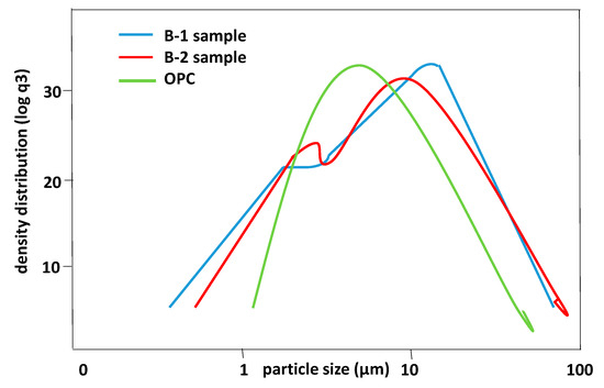 The particle size distribution curves for both samples are similar, exhibiting two peaks: one around 6 μm for both, and a second at 9.5 μm for sample B-2 and 15 μm for sample B-1 (Figure 4). These results suggest that, based on particle size, both samples can be considered potential pozzolans.