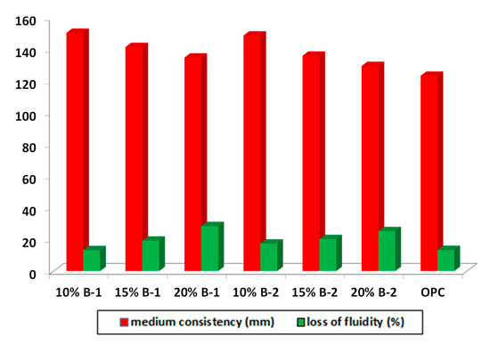 The mortar consistency results are shown in Figure 5. For each type of cement, average values from three consistency determinations are provided. Additionally, the loss of fluidity in the cement with ballast replacement, relative to OPC, is represented and calculated using Equation (1).