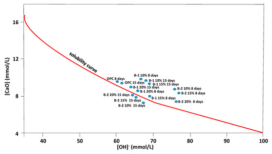 All samples with substitutions at 8 days are located above the CaO solubility curve, with a tendency to be positioned to the left of the CaO/OH− solubility curve relative to OPC. This corresponds to an increase in the concentration of Ca2⁺ released during the hydration process of the new cements. The sample B-2 mortars at 8 days deviate from the rest and from OPC, although they maintain the tendency to be positioned above the solubility curve.