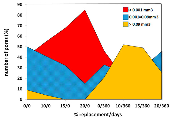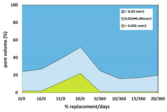 Large-volume pores are scarce at all reaction times and residue substitution proportions. Medium-volume pores in OPC remain constant throughout the entire hydration reaction. Small-volume pores are the most numerous, increasing in number throughout the test for both substitutions (Figure 8).