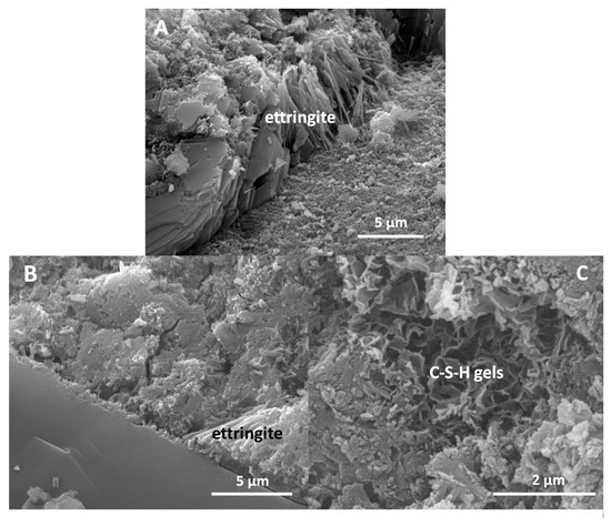 Over time, pores are filled by the precipitation of ettringite, interacting with C-S-H gels, as observed in Figure 10C.