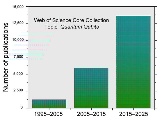 The total number of publications on quantum qubits. Data are extracted from the Web of Science Core Collection with the topic “quantum qubits”.