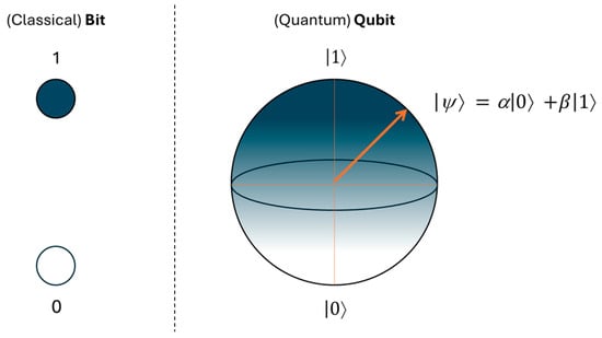 This section provides an overview of the fundamental properties of quantum qubits. A quantum qubit (or simply “qubit”) serves as the fundamental unit of quantum information, analogous to a classical bit. However, unlike a classical bit, which can only exist in a definite state of 0 or 1, a qubit can exist in a superposition of both states simultaneously (as graphically presented in Figure 2). These two basis states are typically represented as ∣0⟩ and ∣1⟩ [1,29]. The general state of a qubit is given as follows: