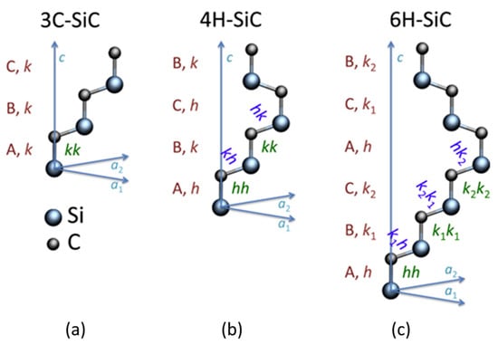 The 3C polytype, shown in Figure 4a, has cubic symmetry, with a single C and Si atom in the primitive cell. The 4H polytype has hexagonal symmetry with eight atoms in the primitive cell, of which two are non-equivalent for both Si and C (Figure 4b). The 6H polytype is also of hexagonal symmetry, has 12 atoms in the primitive cell, and 3 are non-equivalent for both Si and C (Figure 4c). Therefore, a single-site defect in 4H has two configurations, and three in 6H-SiC. A pair defect then has four and six configurations in 4H and 6H-SiC, respectively. The non-equivalent sites are denoted as h (hexagonal) and k (quasi-cubic) [52,53].