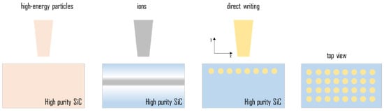 A critical requirement for the successful implementation of SiC-based quantum technologies is the controlled introduction and manipulation of point defects. Various techniques have been developed to create and stabilize these defects, including ion implantation, neutron irradiation, and femtosecond laser processing [14,15,16,17,18]. Radiation-induced defects, in particular, are of great interest due to their potential for generating well-defined qubit properties through precise defect engineering. However, several challenges remain [2,4]: