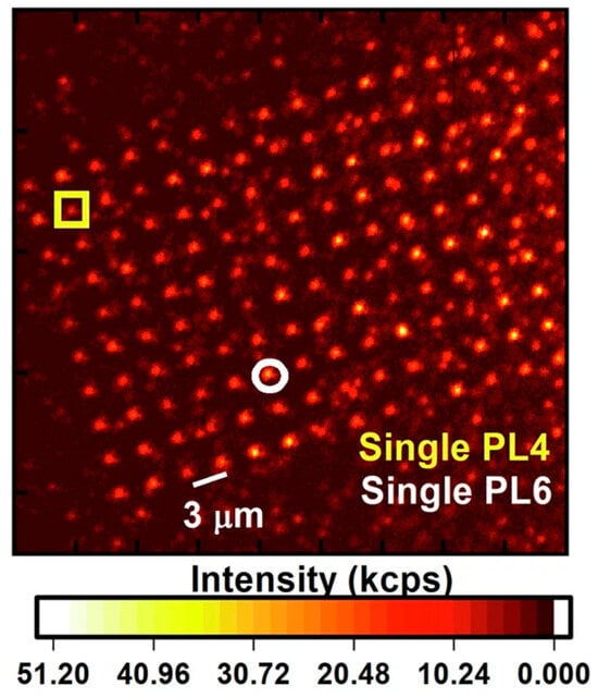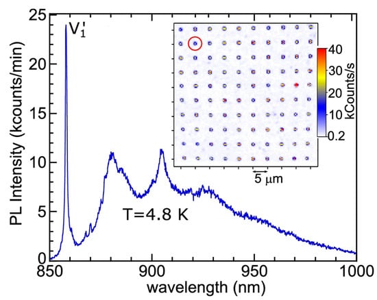 Pavunny et al. [18] used low-doped n-type SiC epitaxial layers (10 µm-thick). They performed room-temperature 100 keV Li ion beam implantation in the form of 10 × 10 square matrix arrays of spots using one of the nine different fixed doses in the range of 10–6000 ions/spot (2.01 × 1012–1.20 × 1015 ions cm−2) on a particular cell. Figure 7 shows the PL spectrum at 4.8 K, acquired from an individual spot of a 10 × 10 array implanted at a dose of 1.2 × 1014 ions/cm2. The single spot (600 ions/spot) is identified (red circle) in the low-temperature confocal fluorescence map (Figure 7, inset).