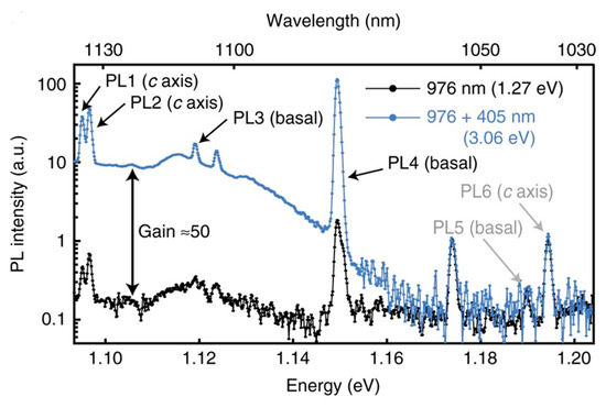 As already said, the divacancy has four configurations in 4H-SiC (hh, kk, hk, and kh), which are shown in Figure 5. Correspondingly, there are four PL lines in 4H-SiC, known as Pl1, PL2, PL3, and PL4 [22,56,69]. The PL5 and PL6 lines, which have been previously detected but not convincingly assigned, are suggested to be related to the modified divacancies located at or near Frank-type stacking faults [28]. Figure 9 shows the PL spectrum of the various divacancies in 4H-SiC, with six PL lines being observed. While investigating the individual divacancy arrays in 4H-SiC introduced by He FIB, He et al. [28] studied the so-called modified divacancies, PL5 and PL6. Their results indicated PL6 as a defect with exceptional properties for quantum applications.