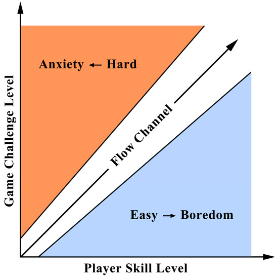 Flow, which is the mental state in which a person performs an activity with full immersion and enjoyment [26], was proposed by Mihaly Csikszentmihalyi (1975). Due to the natural relationship between challenge and skill, it has been widely referred to across various fields. The primary goal of games is to create entertainment through intrinsic motivation, which is highly correlated with flow. As a result, flow can be refined into a map between player skill and game challenge (shown in Figure 1) [27]. Flow occurs when players face challenges that match their skills during gameplay. Players whose current skill level is certainly below the game challenge level will feel anxious, whereas challenges that are too easy will cause boredom for more skilled players. Either situation may lead to players giving up playing. As a result, the game should balance its challenges and the player’s skill to address and overcome the above situations to keep the player inside the flow channel, thus providing a better experience. As the size of the potential audience grows, designing such a balance will become increasingly difficult for game designers.