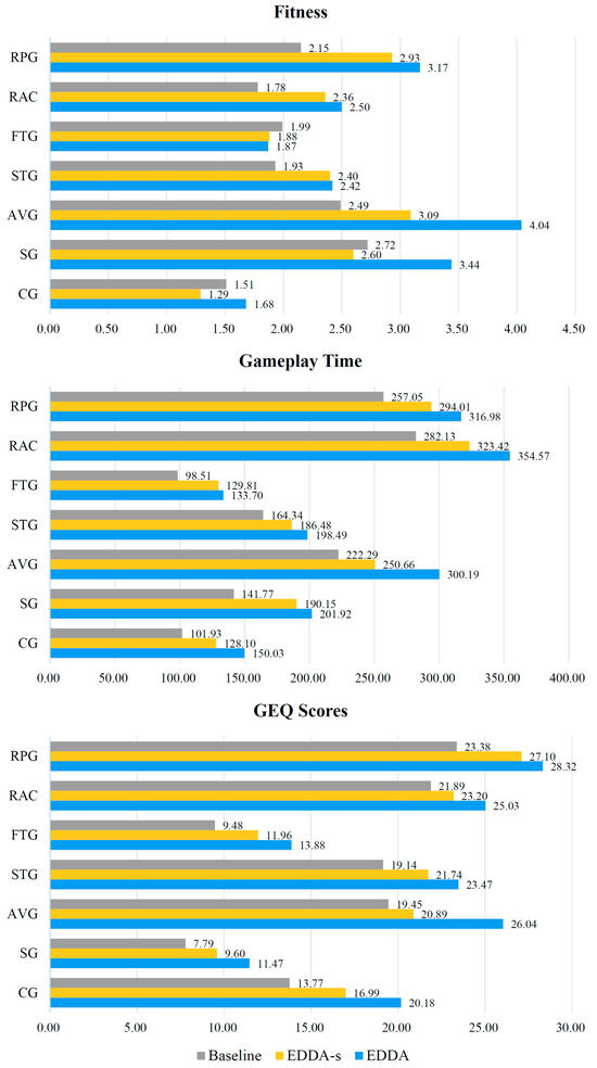 Furthermore, the AVG has the highest absolute increment of all core metrics of EDDA compared to the baseline among the seven major genres in Figure 2, while the FTG, STG, and RAC have the lowest ones in fitness, gameplay time, and GEQ scores, respectively. The relative increments of the AVG in fitness, CG in gameplay time, and SG in GEQ scores are the highest, while the lowest genres are consistent with the absolute increment. It follows that EDDA is more applicable to the AVG than others. Visually, the improvements for EDDA-s and EDDA in gameplay time and GEQ scores appear consistent across genres. It is noteworthy that fitness is decreased when EDDA-s and EDDA are implemented in the FTG. The reason for this lies in the fixed shorter round duration limit of the FTG. The maximum value of gameplay time in each trial of EDDA-s and EDDA does not vary much from that of the baseline, whereas the higher mean leads to a slightly lower fitness. In terms of the descriptive statistic measures in Table 3, EDDA-s and EDDA distinctly improve the central tendency of the metrics while reducing statistical dispersion to a certain degree. Considering the overall results, EDDA’s advantages far outweigh its flaws.
