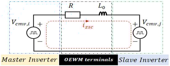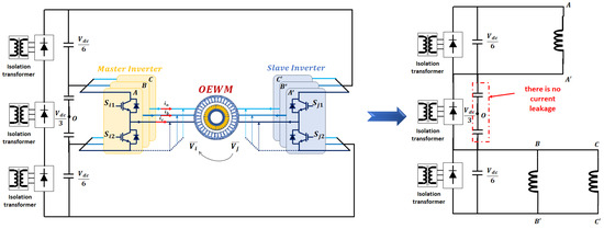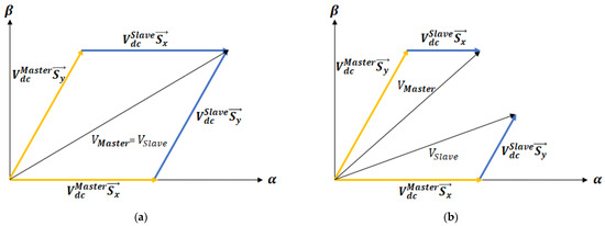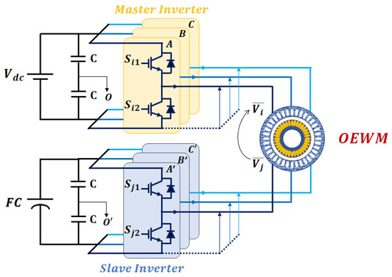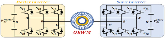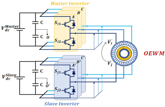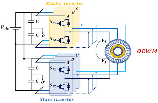 where , , and , , represent the three-phase pole voltages of the master inverter and the slave inverter, respectively.