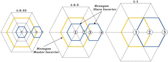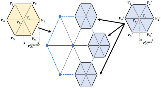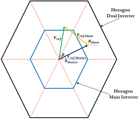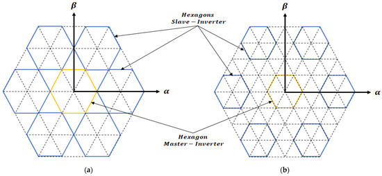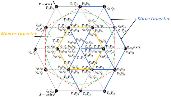 Based on this principle, the space vector diagram of a DTLI can be represented in Figure 5, where the hexagonal space vector set generated by the slave inverter ‘orbits’ around the hexagon of the master inverter.