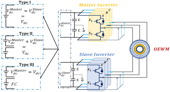 In the literature, three different types of system configurations powered by two inverters are identified (see Figure 6): (i) a single common DCB source, (ii) two isolated DCB sources, and (iii) a single DCB source with a floating capacitor.