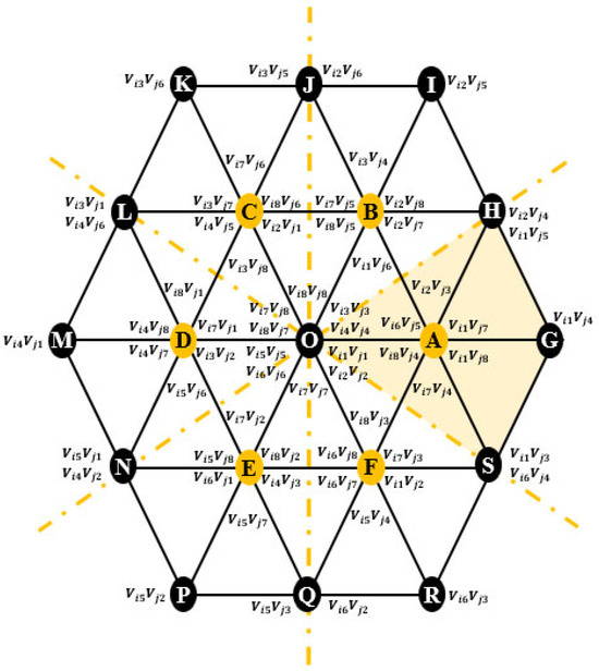 Consequently, the DTLI configuration uses twelve semiconductor switching devices (typically IGBTs or MOSFETs) and twelve antiparallel diodes. This configuration relies on the combination of the space vectors from both inverters, resulting in 64 () possible switching combinations distributed across 19 distinct spatial locations. In this configuration, the set of space vector hexagons generated by the slave inverter ‘orbits’ around the space vector hexagon of the master inverter. This DTLI configuration is similar to that of a three-level inverter, as shown in Figure 8. It consists of three hexagons with vertices of different lengths: a vertex of length (hexagon ABCDEF), a vertex of length (hexagon HJLNQS), and a vertex of length (hexagon GIKMPR). Table 2 summarizes the classification of these three hexagons into different vector groups.