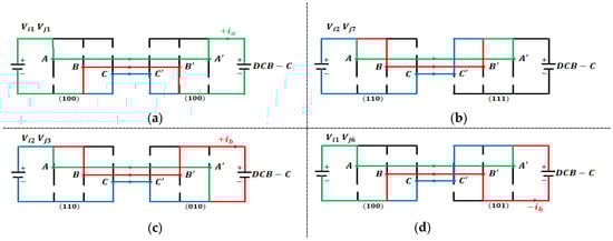 - Type 1 vectors: These vectors induce two opposite current flows within the same phase, such as positive and negative currents in phase , depending on the specific switching states.