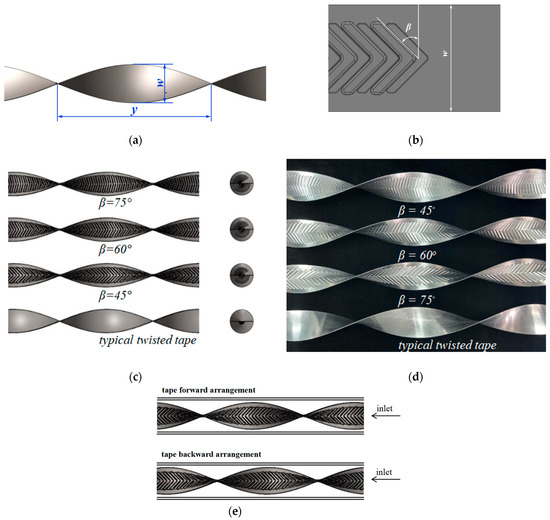The new continuous V-rib twisted tapes (CVRTs) tested in this study are shown in Figure 1a–e. Their design aims to improve heat transfer by combining continuous V-ribs with helical flow patterns, which would be an effective method that integrates geometric disruption and rotational momentum effects to enhance performance. This structure might enhance thermal performance through a synergistic interplay of turbulent flow disruption, augmented surface area, and secondary flow generation. The continuous V-rib twisted tapes were formed from 0.9 mm thick aluminum sheets because of their excellent thermal conductivity, lightweight properties, and ease of manufacturability. The sheets were cut into tapes that were 1500 mm long (y) and 60 mm wide (w). Each tape was placed between two meshed gear rollers, which imprinted ribs onto the plate’s surface in a rolling process. The rib attack angle is determined by the gear rollers’ helix angle. This attack angle might play a critical role in influencing the fluid and heat transfer mechanisms of the testing structure. Specifically, ribs with a fixed attack angle are first rolled on one side of the tape, and the centerline is used as a reference to assure symmetry and uniformity. The tape was then flipped, and the rolling process was repeated on the opposite side, resulting in a continuous V-rib pattern that spanned both surfaces. This continuous V-rib shape not only increased the surface area but also created a more complex flow path for the working fluid, thereby enhancing turbulence and heat transfer. After the ribs were formed on the tape, the tape was transferred to a twisting machine for further processing. One end of the tape was fixed, while the other was attached to a rotating clamp. By rotating the clamp, the tape was twisted along its axis with a twist ratio of 4.0. Three CVRTs were fabricated with varying attack angles (β) at 15°, 30°, and 45° while maintaining consistent rib extrusion depth and edge distance, which would avoid introducing additional variables that could complicate the interpretation of results.