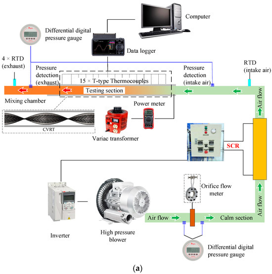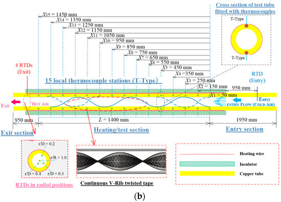 A detailed configuration of the experimental facility is displayed in Figure 2a,b. The test configuration has four segments: the intake, pressure stabilization and temperature regulation, testing, and data measurement and processing systems. The intake system comprises an inverter and a 7.5 kW high-pressure fan, employing air as the working medium. The pressure stabilization and temperature regulation system includes two orifice flow indicators, pressure gauges, a temperature-controlled heater, and a resistance temperature detector (RTD). It is designed to precisely regulate the intake temperature and pressure at specified values. Moreover, the gas line system utilizes stainless steel piping with a diameter identical to that of the test section. This is conducted to eliminate the impact on test outcomes resulting from variables such as alterations in pipe diameter. The testing apparatus has a uniform heat distribution due to a continuous V-rib twisted tape, two pressure gauges, two RTDs, and several thermocouples. A constant heat flux was maintained in the system’s copper tube. This tube was 1500 mm long, had a 60 mm inside diameter, and a 2 mm wall thickness. Its outside was wrapped with 0.7 mm diameter nichrome heating wire with a 46 Ω resistance. The pipe surface was insulated to ensure uniform heat flux.