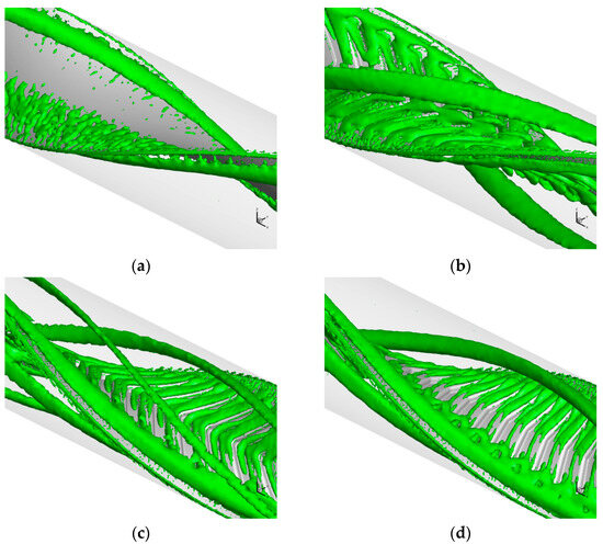 Effect of V-rib attack angle (β) and tape arrangement on flow structure at Re = 10,000. (a) Typical twisted tape (TT). (b) Forward arrangement, CVRT, β = 45°. (c) Backward arrangement, CVRT, β = 45°. (d) Backward arrangement, CVRT, β = 15°.