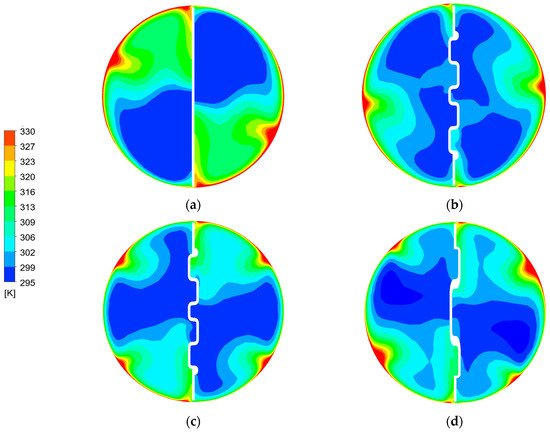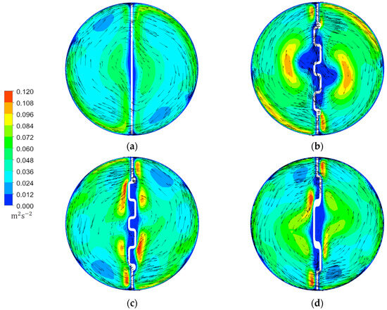 Figure 5 and Figure 6 demonstrate the contours of velocity vectors, TKE, and fluid temperature within a round tube containing twisted tape inserts. As displayed in Figure 5a, a typical twisted tape insert provides relatively low and symmetrical TKE distribution. The flow is smooth, no significant vortex structure can be found, and the boundary layer is thick. The continuous V-rib twisted tape inserts exhibit higher TKE with a distribution mode, which is accompanied by significantly alternating and disordered vector directions. The phenomenon indicates that the V-ribs increase flow complexity. Figure 5b,c illustrate the differences between the forward and backward arrangement. The backward-arranged tape creates more disturbance. Figure 5d shows that the tape with a smaller attack angle, β = 15°, has the most complex distribution and irregular vector distribution. The wall displays streams of swirling flow, while the continuous V-rib twisted tapes, positioned behind the tube core, induce longitudinal vortex flow. The CVRTs induced additional swirling flow near the ribs. Swirling and longitudinal vortex flows promote wall and core flow zone mixing. The vortex structure is dense and evenly distributed, while the boundary layer is periodically broken and reattached. The temperature distribution (Figure 6) is consistent with the TKE region, which verifies the effect of continuous V-ribs on turbulent disturbance with thermal boundary layer destruction and air mixing.