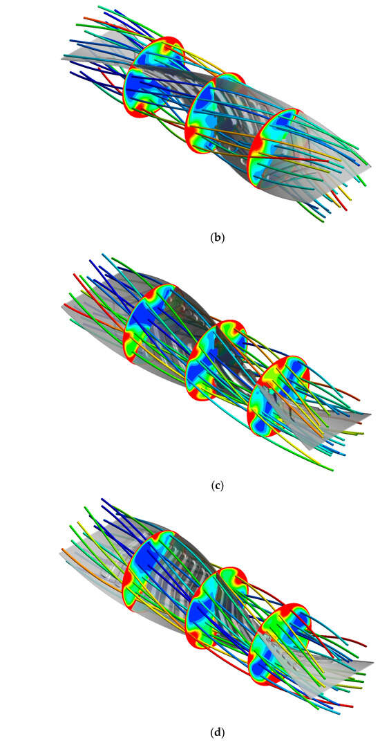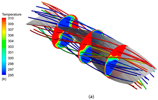 Figure 7a–d present the contour plots of streamlines and temperature fields for tubes fitted with a typical twisted tape (TT) and continuous V-rib twisted tapes (CVRTs) at various attack angles (β), evaluated at a Reynolds number of 10,000. The temperature distribution for the TT case reveals two distinct regions of extremely high and low temperatures, indicating poor thermal mixing and limited disruption of the thermal boundary layer. This non-uniformity suggests that the TT generates relatively weak secondary flow structures, which are insufficient to enhance heat transfer effectively across the tube’s cross-section. In contrast, the CVRT configurations exhibit significantly more uniform temperature fields and thinner thermal boundary layers along the tube wall. The presence of continuous V-shaped ribs promotes stronger secondary flows and more vigorous fluid mixing.