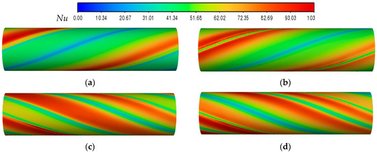 Effect of V-rib attack angle (β) and tape arrangement on the local Nusselt number at Re = 10,000. (a) Typical twisted tape (TT). (b) Forward arrangement, CVRT, β = 45°. (c) Backward arrangement, CVRT, β = 45°. (d) Backward arrangement, CVRT, β = 15°.