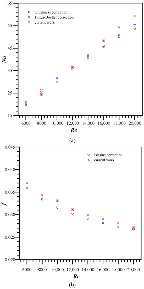 Research on fluid characteristics under turbulent flow within plain tubes has reached a relatively mature stage. In these experiments, data from a plain tube were examined, and the test results were compared with established theories on fluid characteristics under turbulent flow within a plain tube. This is conducted to verify the reliability of the current outcomes. The current study compares the values of the tested Nusselt numbers and friction coefficients of the plain tube, calculated using the corrected formulae of Dittus–Boelter, Gnielinski, and Blasius [30].
