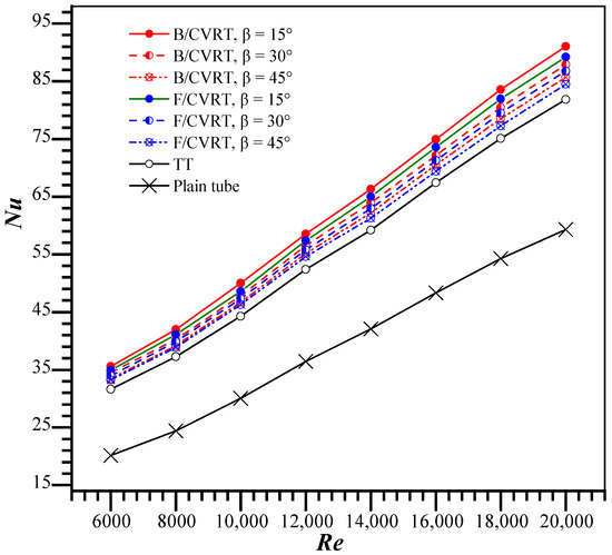As demonstrated in Figure 10, the heat transfer (Nu) enhances with the Reynolds number (Re). The increased Nu for heat transfer improvement exceeds that of a plain tube, which suggests that the heat exchange tube into which twisted tapes are installed demonstrates greater sensitivity to air velocity. A continuous V-rib twisted tape (CVRT) generates stronger longitudinal vortices and more air mixing, which leads to marked heat transfer augmentation. At a constant Re, the heat transfer rate decreases as the attack angle (β) increases. A twisted tape with β = 15° yields the most increase in heat transfer, with a Nusselt number exceeding that of a TT, and CVRTs with attack angles (β) of 30° and 45° by 29.1%, 4.6%, and 7.1%, respectively. Figure 10 demonstrates that the attack angle affects the thermal augmentation of the twisted tape at elevated Reynolds numbers. This occurs since at greater Reynolds numbers, the air velocity and turbulence intensity within tubes containing CVRT inserts increase, resulting in improved heat transfer relative to a plain tube and a TT.