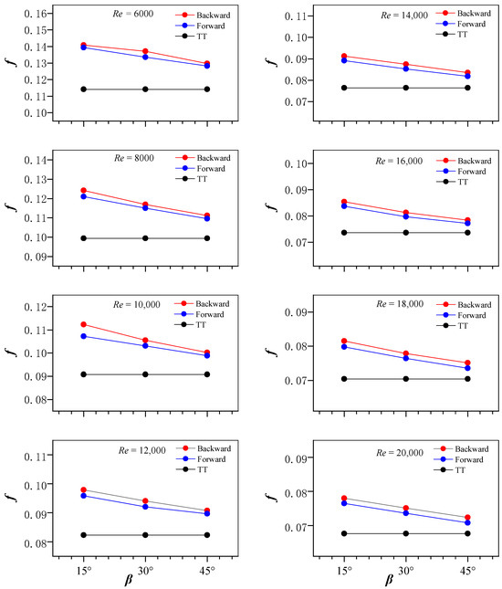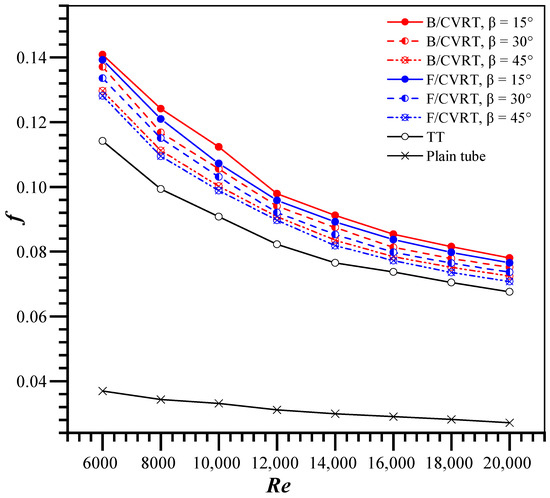 Variations in the friction factor (f) with the Reynolds number for the tested tubes are presented in Figure 11. From the experimental results, f for tubes with CVRTs having attack angles (β) of 15°, 30°, and 45° are 383, 373, and 352% greater than a plain tube, respectively. At a given Reynolds number, the friction factor shows an identical trend as the angle variation. Regardless of the Reynolds number, a CVRT with β = 15° generates maximal friction losses. This suggests that within the range of heat transfer augmentation reported in this paper, increased heat transfer augmentation inevitably leads to greater pump work losses. The friction coefficient corresponding to the twisted tape with β = 15° is 6.4% and 12.1% higher than those corresponding to CVRTs with β = 30° and 45°, respectively. This shows that a twisted tape with a smaller attack angle has a stronger capability to promote and disturb fluid flow, which elevates the fluid velocity and flow resistance. It also explains the variation in the Nusselt number.