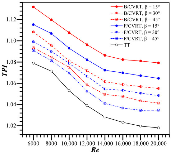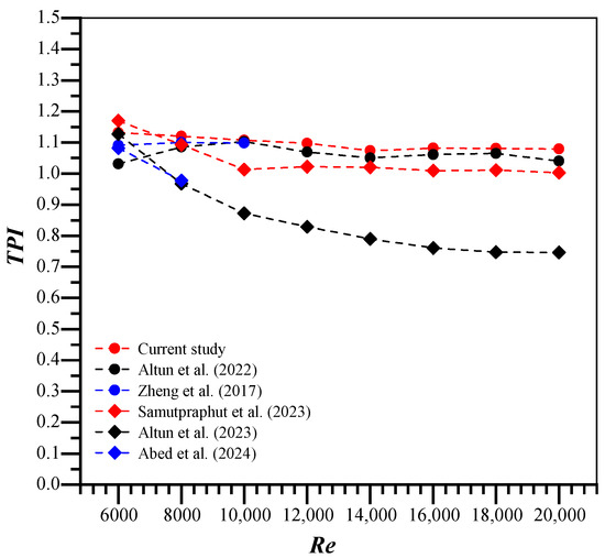 Evaluating the thermal performance based on the Nusselt number is not advisable. Since the pressure loss increases rapidly as the Nusselt number rises, this will lead to higher energy consumption. A comprehensive thermal performance index (TPI) is adopted based on a balance between augmented friction losses and enhanced thermal exchange [25,26]. The thermal performance index (TPI) is a ratio of the thermal exchange coefficient with an augmentation device compared to that with no augmentation device at an identical pumping power, as follows: