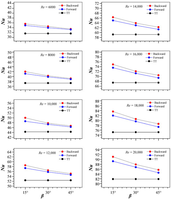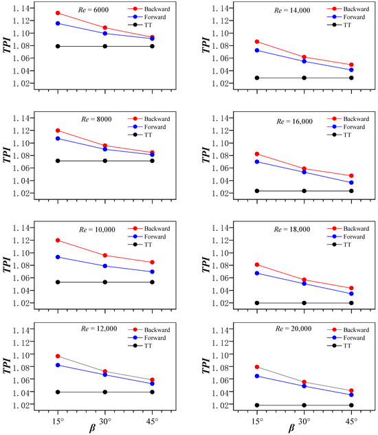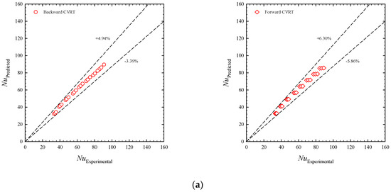 Figure 16a–c compare the experimental data (Nuexp, fexp, and TPIexp) with the predicted results (Nupred, fpred, and TPIpred). The current testing results and predicted values of V-rib attack angles (β = 15°, 30°, and 45°) in the forward arrangement vary by ±6%, ±5%, and ±2% for Nu, f, and TPI, respectively. In the backward arrangement, they vary by ±4%, ±2%, and ±1%, respectively.