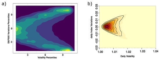 We analyze the S&P500 index as an example to obtain a whole perspective. Figure 1 shows the empirical joint distribution of the volatility–return index from March 1982 to June 2024. One can distinguish, in particular in (a), three states: one of low positive returns and low to moderate volatility (normal times), another zone of meager returns and high volatility, times of instability or crisis (lower right zone), and another zone of positive returns and moderate to high volatility, times of up-market or bubbles (upper right zone).