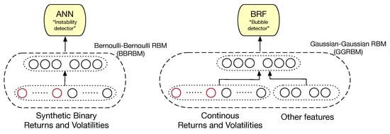 Figure 2 shows the general warning model. The BBRBM’s mission is to capture complex representations of the system in the hope that it has some level of discriminative power to distinguish between a normal and unstable state. The GGRBM’s task goes in the same direction but to identify bubble periods or an approximation to a critical time . The information in these high-level representations embedded and learned by the RBMs can help predict the properties of a specific set of financial index samples. However, since the RBM is a generative model, we can use it, mainly the GGRBM, to reproduce synthetic samples under certain fixed interest conditions and find the bubble probability, as seen in Section 4.5.