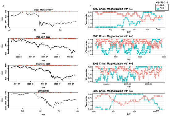 Figure 3b shows magnetization diagrams of different crises. The magnetization is the average of the last k states. Thus, in the example above, the magnetization of volatility at t when , would be ; similarly, for the returns. Then, in Figure 3a, we presented four crises: Black Monday in 1987, the dot-com crisis in 2000, the Subprime crisis in 2008, and the COVID-19 crisis in 2020. Each time series represents the value of the index at the indicated dates. Applying the model to the four crises, we can see in Figure 3b that for , one can obtain that after the critical moment , the magnetization of the volatility is very close to 1, while that of the returns is close to zero, indicating a clear transition of the system to a state of high instability (high variability and negative returns).