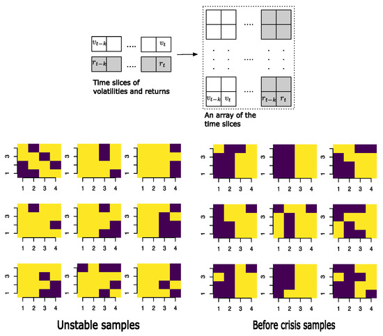 To better understand the features used to train the BBRBM, we present in Figure 4 time slices with eight lags for volatility and returns of the S&P500, represented in 4 images. The first two columns of each image depict the states of 8 consecutive days of volatility, and the following two columns represent the same 8 days of returns. As we observe, samples corresponding to periods of instability tend to be in high volatility (yellow color or +1 state) and low/normal volatility (purple color or zero state). In comparison, periods just before instability (BTC) are characterized by states of low volatility (purple color or zero state) and medium or high returns (yellow color or +1 state).