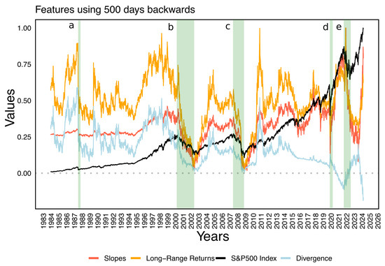 Time series of the S&P500, their respective values of long-range returns, and slopes using days. The divergence between long-range returns and slopes is . The vertical stripes in yellow highlight the periods of instabilities between the maximum value of the index and its lowest value. The strip (a) represents the Black Monday of 1987, (b) the dot-com crisis of 2000, (c) the Subprime crisis of 2008, (d) the COVID-19 outbreak, and (e) the stock market decline of 2022. Note: The index values and features have been scaled to values between 0 and 1 to improve the readability of the time series and their relationship to each other.
