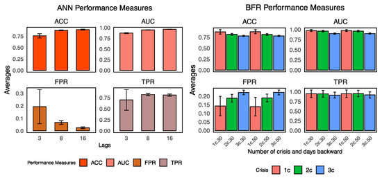 ANN performance measures to detect unstable samples using 10-fold cross-validations. ANNs were trained using synthetic samples with different numbers of lags k of volatility and returns. Right: Performance measures on BRF training using 1c (1987 crisis, Black Monday), 2c (1987 and 2000 crises), and 3c crises (the two previous crises and the 2008 crisis), and using 30 and 50 days backward from the critical point to define the class variable. The performances are measured on the test dataset. In each training, a randomized training and test dataset is used at a ratio of 80% and 20%, respectively. Note: ACC is accuracy, AUC is the area under the curve, FPR is false positive rate, and TPR is true positive rate.