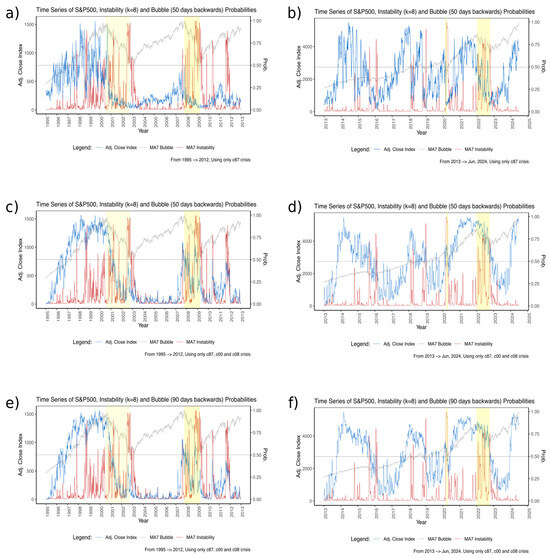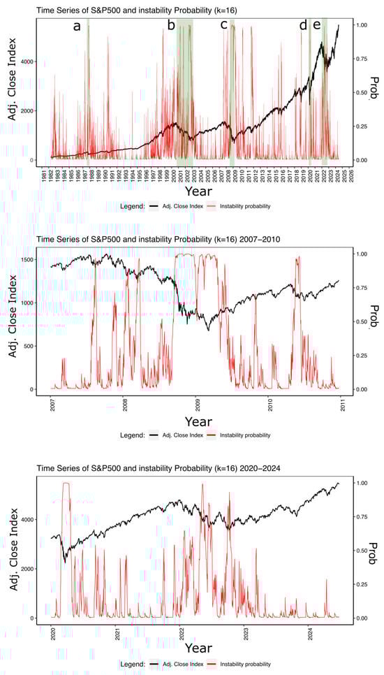 Time series of the S&P500 index (green color) on the y-axes left, and the probabilities of instability for each day (red color) in the y-axes right based on the BBRBM-ANN with lags. The vertical stripes in yellow highlight the periods of instabilities between the maximum value of the index and its lowest value. The strip (a) represents the Black Monday of 1987, (b) the dot-com crisis of 2000, (c) the Subprime crisis of 2008, (d) the COVID-19 crisis, and (e) the stock market decline of 2022. Note: The index values and features have been scaled to values between 0 and 1 to improve the readability of the time series and their relationship to each other. The two plots below show the same in more detail for the 2008 Subprime crisis and the COVID-19 crisis through July 2024.