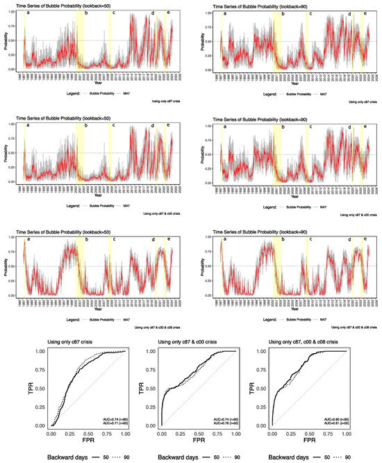 The most interesting results are in variants M and N (Case 6). In these simulations, we predefined a situation characteristic of a financial bubble in which we have substantial cumulative returns and slopes. In M, the volatilities of the last 4 days are high, while in N, they are low. This difference alone marks a noticeable change in the bubble probabilities according to the model, indicating that even when we have features that account for a bubble, the probability of this is strongly conditioned by the state of volatility of the last few days. Note that variants H and I (case 4) are very similar to M and N, only that we leave all volatility features free in these first two. While the model delivers probabilities over 50% in synthetic samples of M and N, neither is the median as high as in those of H and I.