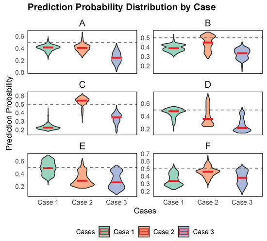Violin plots for bubble probabilities of synthetic samples are estimated with the BRF trained with samples of the hidden units of a GGRBM of 16 hidden units. The GGRGM was trained with samples from the 1987 (Black Monday), 2000 (dot-com), and 2008 (Subprime) crises. Each box presents the bubble probabilities for three primary cases: Case 4 (slopes and cumulative returns at high levels), Case 5 (slopes and cumulative returns at low levels), and Case 6 (slopes and cumulative returns at high levels). In Cases 4 and 5, the volatility features are free to run in the Gibbs sample, while the other features are clamped. In Case 6, only the first four volatility lags are free, and the remaining four are clamped at a high level, as well as the slopes and cumulated returns. The letters indicate the variants used to generate the 1000 synthetic samples. Note: The dotted line indicates the probability of a bubble at 50. The red line inside the violin represents the median.