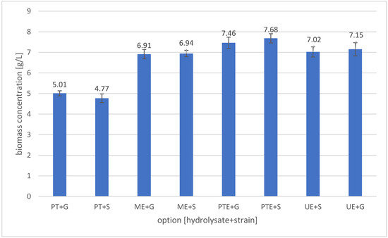 Yeast biomass concentration after cultivation in banana peel hydrolysate. Sample designations: PT + S; PT + G—cultivations of Scheffersomyces stipitis (+S) or Meyerozyma guilliermondii (+G) in PT (Pressure–Thermal) hydrolysate; PTE + S; PTE + G—cultivations of Scheffersomyces stipitis (+S) or Meyerozyma guilliermondii (+G) in PTE (Pressure–Thermal + Enzymes) hydrolysate; ME + S; ME + G—cultivations of Scheffersomyces stipitis (+S) or Meyerozyma guilliermondii (+G) in ME (Microwave + Enzymes) hydrolysate; UE + S; UE + G—cultivations of Scheffersomyces stipitis (+S) or Meyerozyma guilliermondii (+G) in UE (Ultrasound + Enzymes) hydrolysate.