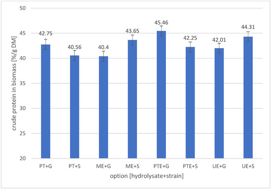 Protein is a key component of biomass for feed purposes. Yeast is characterised by high bioavailability and a rich content of essential amino acids [24,79]. Figure 2 shows the crude protein content in the dry matter of two yeast strains obtained after cultivation in banana peel hydrolysates.
