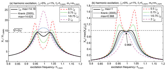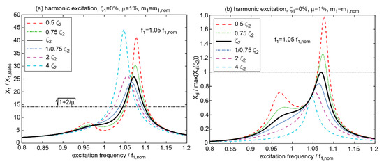 Figure 1 clearly demonstrates that—in the case of precisely known modal parameters—any TMD damping other than the optimum solution (9) increases the primary structure displacement amplitude . Increased TMD damping ( = 1/0.75 ≈ 1.33 and = 2) tends to lock the TMD mass to the primary structure modal mass, whereby the system structure/TMD behaves like a single degree-of-freedom system with increased . Decreased TMD damping does not sufficiently dampen the two resonances of the system structure/TMD, whereby is greater than optimal as well. In addition, the displacement response due to the TMD tuning, according to [13], is included in Figure 1. This tuning leads to a more sound TMD relative motion response with a slope of zero at excitation frequency equal but leads to a greater . In contrast to the case of nominal structural parameters, where nominal TMD damping minimizes , Figure 2 shows that increased TMD damping reduces if the actual modal properties differ from the nominal modal parameters used for TMD design. For the considered case, and , the damping increase factor = 1/0.75 ≈ 1.33 leads to a smaller than that obtained with nominal TMD damping. Hence, increased TMD damping does not reduce the primary structure response if the actual modal parameters agree with those used for TMD design, but increased TMD damping may lead to a smaller primary structure response if the actual modal properties differ from those used for TMD design and if is appropriately selected. The goal of this paper is to provide such damping increase factors, depending on the difference between the actual modal parameters and the nominal modal parameters used for TMD design.