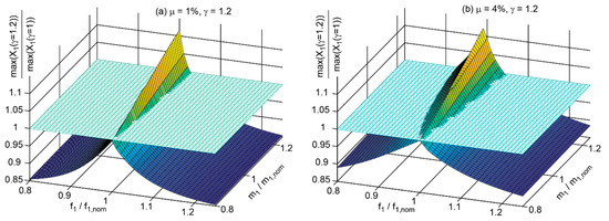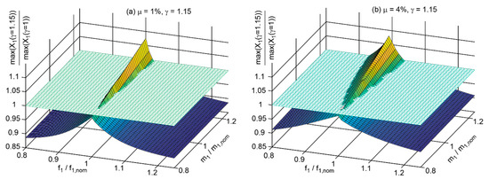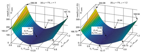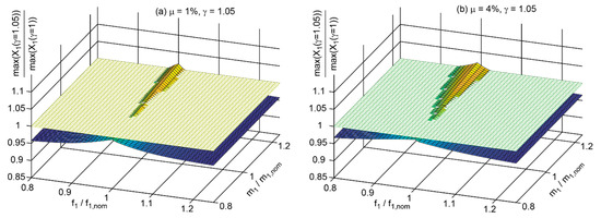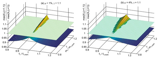 The results of for the TMD mass ratio = 1% and for the considered combinations of and are depicted in Figure 3a for = 1 and in Figure 3b for = 1.20. It is observed that increased TMD damping mainly reduces the maximum displacement amplitude of the primary structure at large deviations between the actual modal parameters, i.e., eigenfrequency and modal mass, and their nominal values; the numbers of are given at selected points on the surfaces in Figure 3a,b.