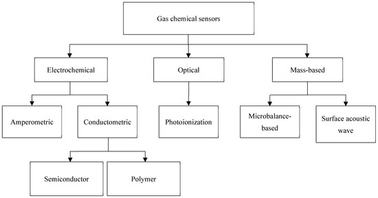 The sensors consist of two basic parts: a receptor part (a chemically sensitive layer with high selectivity for the tested compound or group of chemical compounds) and a transducer part (responsible for generating a signal that can be interpreted). The receptor part is dominated by absorption, adsorption, chemisorption or coordination bonds [64]. The following are examples of a group of chemical sensors used in odourimetric measurements (Figure 1).