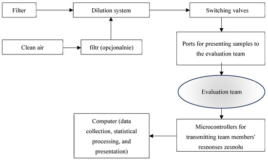 The olfactometric method is one of the most technically advanced methods for determining odour concentration. In many European countries, it is based on strict procedures laid down in standards [83]. It uses a device called an olfactometer, which allows an objective determination of the odour concentration in a gas sample using the human nose as a detector [84]. The schematic representation of such a device is shown in Figure 2.