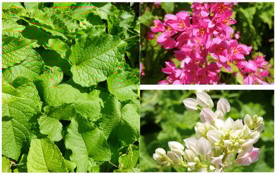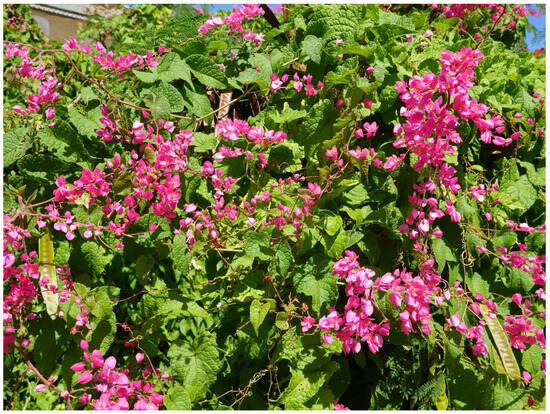 - National Parks Singapore. Antigonon leptopus Hook. & Arn. Flora Fauna Web. 2022. Available online: https://www.nparks.gov.sg/florafaunaweb/flora/1/3/1312 (accessed on 6 February 2025).