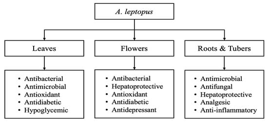 Different parts of the plants had varying bioactivities, which may contribute to the previously discussed phytochemicals present. In vivo and in vitro studies were utilized to test the pharmacological properties of A. leptopus, revealing antioxidant, antibacterial, antimicrobial, antidiabetic, anti-inflammatory, and anticancer activities, as presented in Table 2 and in Figure 4.